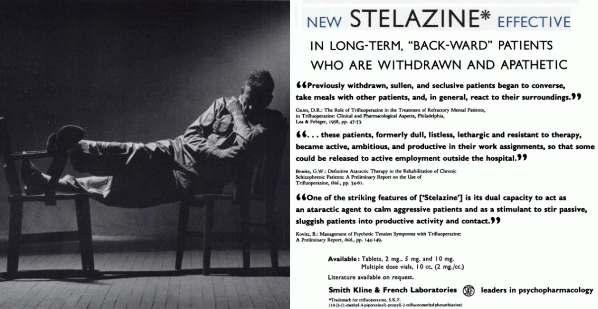 Stelazine advertisement, 1959. Mental Hospitals, Vol. 10, No. 1. NEW   STELAZINE*   EFFECTIVE IN LONG-TERM "BACK-WARD" PATIENTS WHO ARE WITHDRAWN AND APATHETIC Smith, Kline & French Laboratories           leaders in psychopharmacology *Trademark for trifluoperazine, S.K.F. |