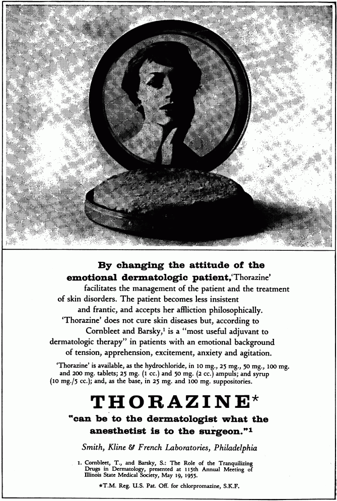 Thorazine advertisement, 1957. California Medicine, Vol. 87, No. 1, p. 11. By changing the attitude of the emotional dermatologic patient, 'Thorazine' facilitates the management of the patient and the treatment of skin disorders. The patient becomes less insistent and frantic, and accepts her affliction philosophically. 'Thorazine' does not cure skin diseases but, according to Cornbleet and Barsky,1 is a "most useful adjuvant to dermatologic therapy" in patients with an emotional background of tension, apprehension, excitement, anxiety and agitation. 'Thorazine' is available, as the hydrochloride, in 10 mg. 25 mg., 50 mg., 100 mg. and 200 mg. tablets; 25 mg. (1 cc.) and 50 mg. (2 cc.) ampuls; and syrup (10 mg./5 cc.); and, as the base, in 25 mg. and 100 mg. suppositories. THORAZINE* "can be to the dermatologist what the anesthetist is to the surgeon."1 Smith, Kline & French Laboratories, Philadelphia 1. Cornbleet, T., and Barsky, S.: The Role of the Tranquilizing Drugs in Dermatology, presented at 115th Annual Meeting of Illinois State Medical Society, May 19, 1955. *T.M. Reg. U.S. Pat. Off. for chlorpromazine, S.K.F. |